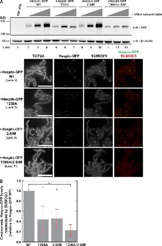 SUMOylation of DNA topoisomerase IIα regulates histone H3 kinase Haspin and H3 phosphorylation in mitosis.