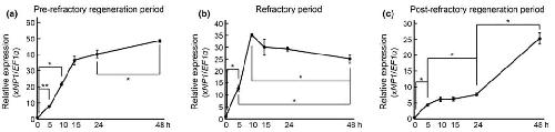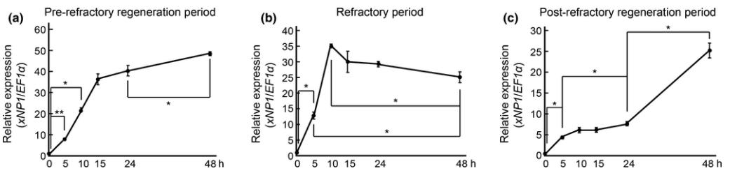 Real-time RTâPCR of xNP1-transcripts in tail tissues of the âpre-refractory regenerationâ, ârefractoryâ, and âpost-refractory regenerationâ period tadpoles within 48 h after amputation. Real time RTâPCR was performed using total RNA extracted from the tail stumps (2-mm wide tail tissues) of the (a) âpre-refractory regenerationâ, (b) ârefractoryâ, and (c) âpost-refractory regenerationâ period tadpoles at 0, 5, 10, 15, 24 and 48 h after amputation. The numbers of individuals used for experiments were: 15â16 à 4 lots, 20 à 4 lots, and 5 à 4 lots for âpre-refractory regenerationâ, ârefractoryâ, and âpost-refractory regenerationâ periods, respectively. The relative amounts of xNP1 transcripts determined by real-time RTâPCR were obtained by taking the value at 0 h after amputation as 1 for each (a) âpre-refractory regenerationâ period, (b) ârefractoryâ period and (c) âpost-refractory regenerationâ period after normalization relative to elongation factor 1α (EF1α) transcript levels. The bars indicate standard errors. Single and double asterisks indicate statistically significant differences: P < 0.05 and P < 0.01 using the TukeyâKramer method.