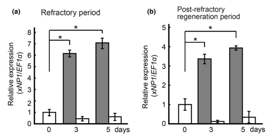 Real-time RTâPCR of xNP1-transcripts in tail tissues of the ârefractoryâ and âpost-refractory regenerationâ period tadpoles on days 0, 3, and 5 after amputation. Real time RTâPCR was performed using total RNA extracted from the tail stumps (2-mm wide tail tissues) of the (a) ârefractoryâ and (b) âpost-refractory regenerationâ period tadpoles on days 0, 3, and 5 after amputation. As a control, we used total RNA extracted from tissues of the same tail parts: for example, 2-mm wide tissues at the distal one-third of the intact tails from tadpoles at the same developmental stages, on days 3 and 5 after the tails of the experimental group were amputated. The shaded and open bars indicate amputated tail stumps and intact tails, respectively. The numbers of individuals used for the experiments were: 16â24 à 3â4 lots and 2â5 à 2â4 lots for ârefractoryâ and âpost-refractory regenerationâ periods, respectively. The relative amounts of xNP1 transcripts determined by real-time RTâPCR were obtained by taking the value at day 0 as 1 for each (a) ârefractoryâ period and (b) âpost-refractory regenerationâ period after normalization relative to elongation factor 1α (EF1α) transcript levels. The bars indicate standard errors. Asterisks indicate statistically significant differences: P < 0.05 using the Tukey-Kramer method. image, Intact tails; image, Amputated tail stumps.
