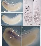 Expression analysis by immunostaining of xNP1 in the amputated tail stumps and regenerating tails of the ârefractoryâ and âpost-refractory regenerationâ period tadpoles. Immunostaining was performed using amputated tail stumps of the refractoryâ period tadpoles on (a) day 0 and (b and c) days 2 after amputation, and regenerating tails of the âpost-refractory regenerationâ period tadpoles on (d) day 0 and (eâg) days 3 after amputation, with the anti-xNP1 antibody (a, b, dâf) or the same concentration of normal IgG as negative controls (c and g), respectively. The yellow lines indicate outlines of the sampled tails. Panel (f) indicates a magnified view of the boxed area in (e). The arrowhead in panel (f) indicates regenerating notochord. We also performed immunostaining on sectioned tails of (hâj) the ârefractoryâ period and (kâm) the âpost-refractory regenerationâ period tadpoles at 10, 24 and 48 h after amputation. (hâm) Upper left, immunofluorescence images of xNP1 staining; Upper right, merged images of xNP1 staining (red) and Hoechst 33342 staining (blue). the position of the tissues is indicated with colored and dashed lines. sc (light blue), spinal cord; nc (yellow), notochord; ms (gray), mesenchyme; ep (green), epidermis; Lower left, magnified view of xNP1 staining of the boxed area in upper right; Lower right, magnified view of merged images of the boxed area. Arrowheads in (hâm) indicate signals. The bars indicate (aâc) 1 mm, (d, e and g) 0.5 mm, and (hâm) 0.2 mm, respectively.