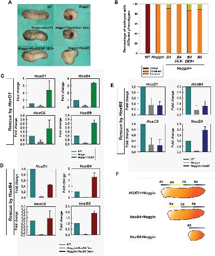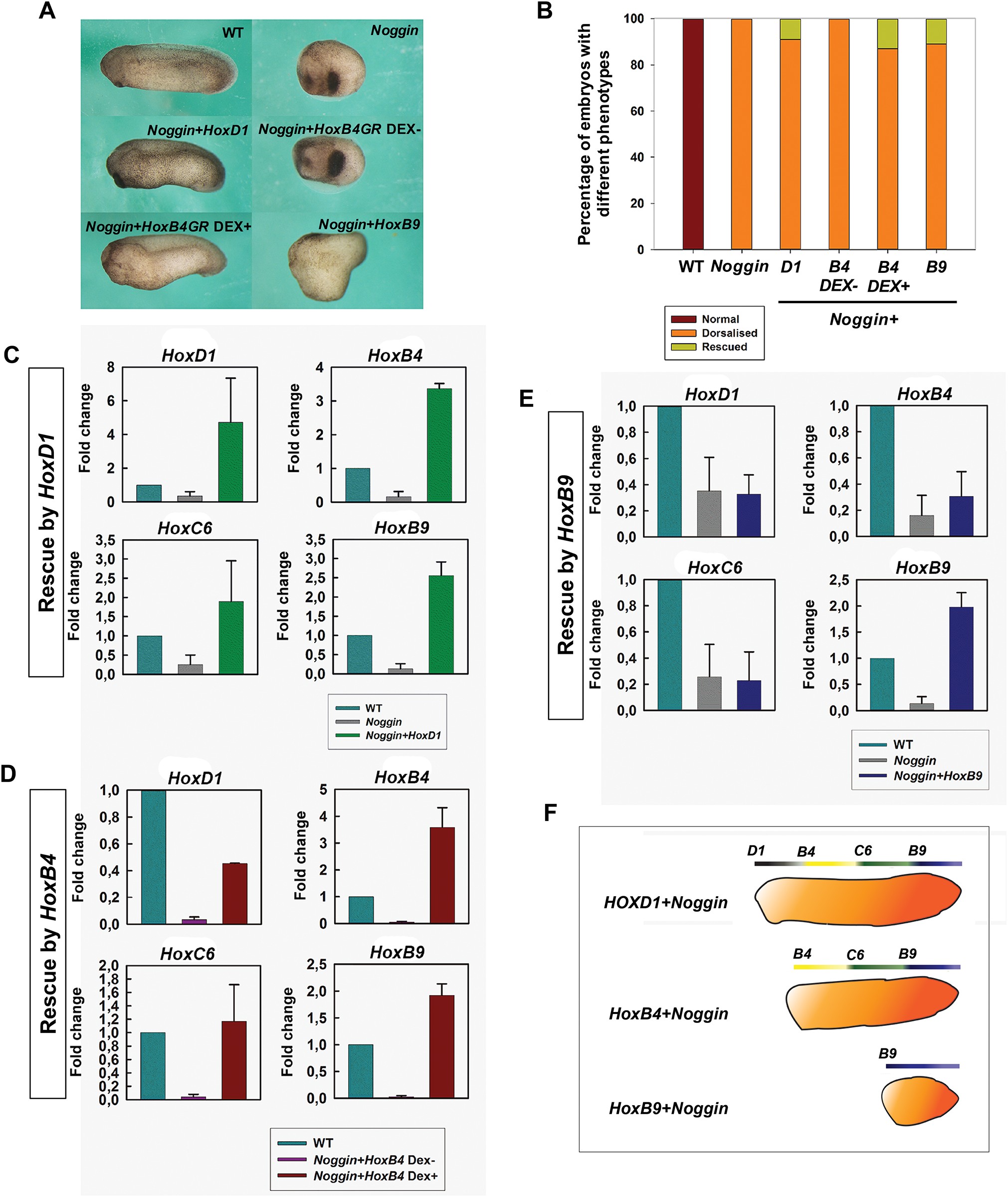 (A) Morphological phenotypes of embryos in different Hox rescue treatments. Anterior is to the left and dorsal is up. (B) Percentage of embryos showing different phenotypes in different treatment groups. From left to right: wild-type (n = 40); Noggin only (n = 32); Noggin and HoxD-1 co-injection (n = 133); HoxB-4 GR and Noggin co-injection, without Dex treatment (n = 46); HoxB4 and Noggin co-injection, with Dex treatment at st.8 (n = 90); HoxB-9 and Noggin co-injection: n = 140. (C-E) Q-PCR for HoxD-1, HoxB-4, HoxC-6 and HoxB-9 in different rescue groups: rescue by HoxD1 (C), rescue by HoxB4 (D), and rescue by HoxB-9. Data are represented as mean ± SEM. (F) Schematic showing different portions of A-P axis and different Hox genes rescued by HoxD1, B4 and B9 respectively.