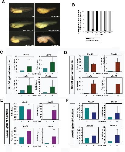 (A) Phenotypes of embryos injected with different Hox RNA. (B) Percentage of embryos showing anterior defects. From left to right: wild-type (n = 30), HoxD-1 injected (n = 54), HoxB-4 GR injected (without Dex treatment) (n = 40), HoxB-4 GR injected (with Dex treatment at st.8) (n = 60), HoxA-7 injected (n = 45), HoxB-9 injected (n = 36). (C) Q-PCR for HoxD1, A2, B4 and C6 in HoxD1 injected embryos. (D) Q-PCR for HoxB2, B4, B5 and A7 in HoxB4 GR injected embryos (activated at st.8). (E) Q-PCR for HoxB4, A7, C8 and B9 in HoxA7 injected embryos. (F) Q-PCR for HoxA7, B9, D10 and D13 in HoxB9 injected embryos.