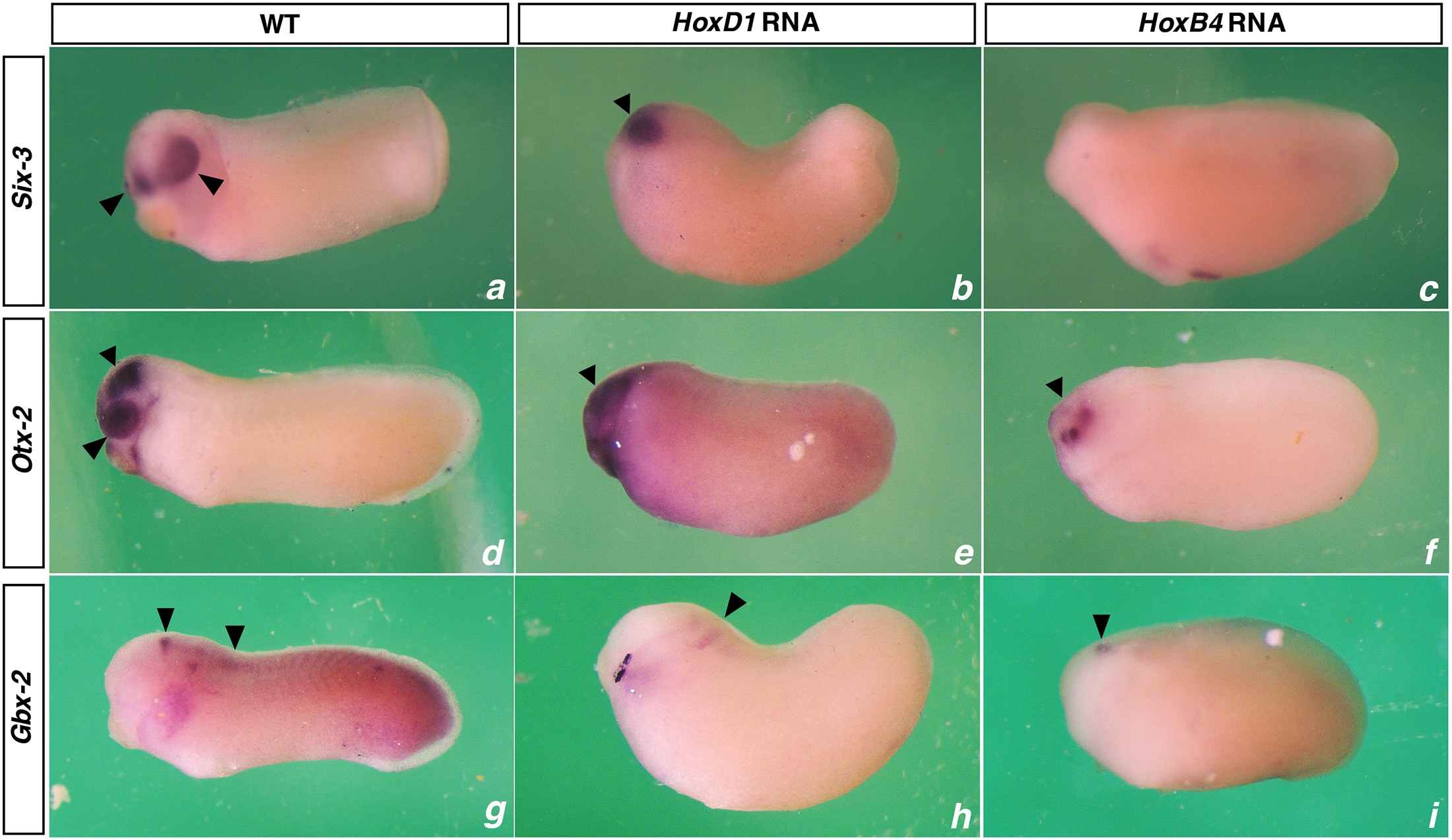 Expression of Six-3 (a, b, c), Otx-2 (d, e, f) and Gbx-2 (g, h, i) are shown for WT, HoxD-1 injected and HoxB-4 GR injected (activated at st.8) embryos.