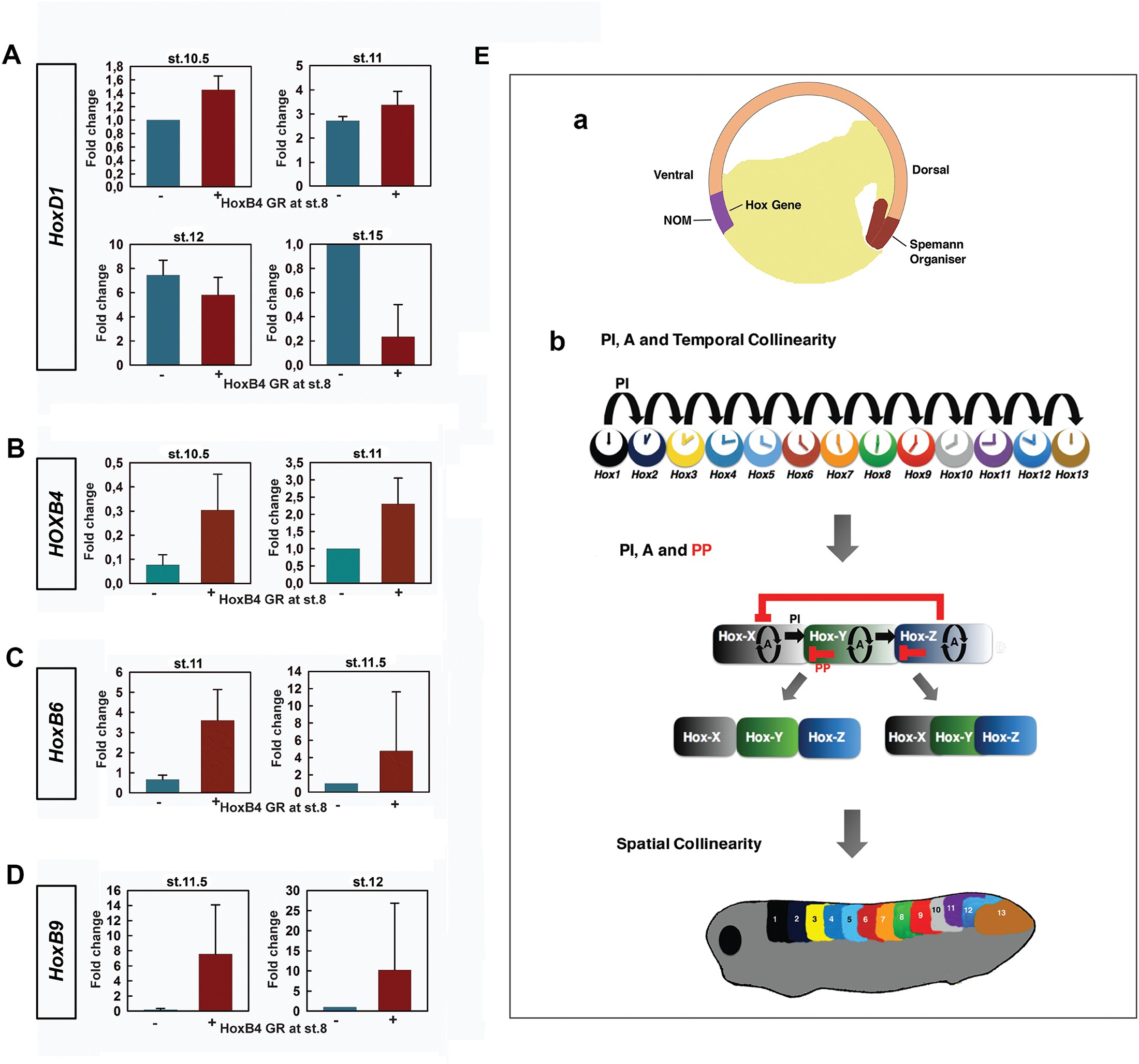 (A) Q-PCR for HoxD1 at st.10.5, 11, 12 and 15 in WT and HoxB4 GR (activated at st.8) injected embryos. (B) Q-PCR for HoxB4 at st.10.5 and 11 in WT and HoxB4 injected embryos. (C) Q-PCR for HoxB6 at st.11 and 11.5 in WT and HoxB4 injected embryos. (D) Q-PCR for HoxB9 at st.11.5 and 12 in WT and HoxB4 injected embryos. (E) The known facts concerning auto-regulation, posterior induction and posterior prevalence in A-P Patterning. (a) Hox genes start to be expressed from early gastrulation onward in the non-organiser mesoderm (NOM), where there are high levels of BMP. At this stage, their nested expression domains overlap fully with each other. (b) During gastrulation and early neurulation, auto-regulation (A) and posterior induction (PI) together enable Hox genes (coloured discs) to be expressed in a temporal order that matches their 3' to 5' order on the chromosome (temporal collinearity) The sequential times of initial expression of the neighbouring Hox genes are indicated by the small clock faces. Since the precise control of Hox activation time is vital to function, posterior induction (black arrows) may possibly occur in a cascade manner to ensure the expression of Hox genes in the correct order. Data is not presently available to determine whether this is the case. Starting from neurulation, posterior prevalence (PP) exerts its influence in neurectoderm and paraxial mesoderm, where there are relatively low levels of BMP. The coordination between auto-regulation, posterior induction and posterior prevalence during this stage helps to establish a pre-pattern, resulting in non-overlapping or partially overlapping expression. Notably, posterior prevalence does not happen in a cascade manner since it is not required for driving the Hox timer. Later during axis elongation, these earlier events lead to a spatial pattern being established (spatial collinearity).