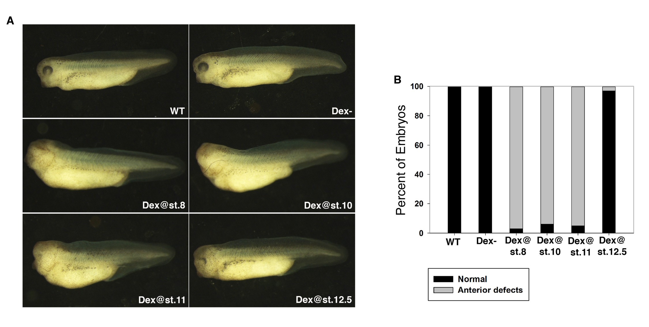 (A) Phenotypes of embryos. Anterior is to the left and dorsal is up; (B) Percentage of embryos showing anterior defects. From left to right: wild-type(n = 36), without Dex treatment (n = 30), Dex treatment at st.8 (n = 32), Dex treatment at st.10 (n = 36), Dex treatment at st.11 (n = 40), Dex treatment at st.12.5 (n = 32).