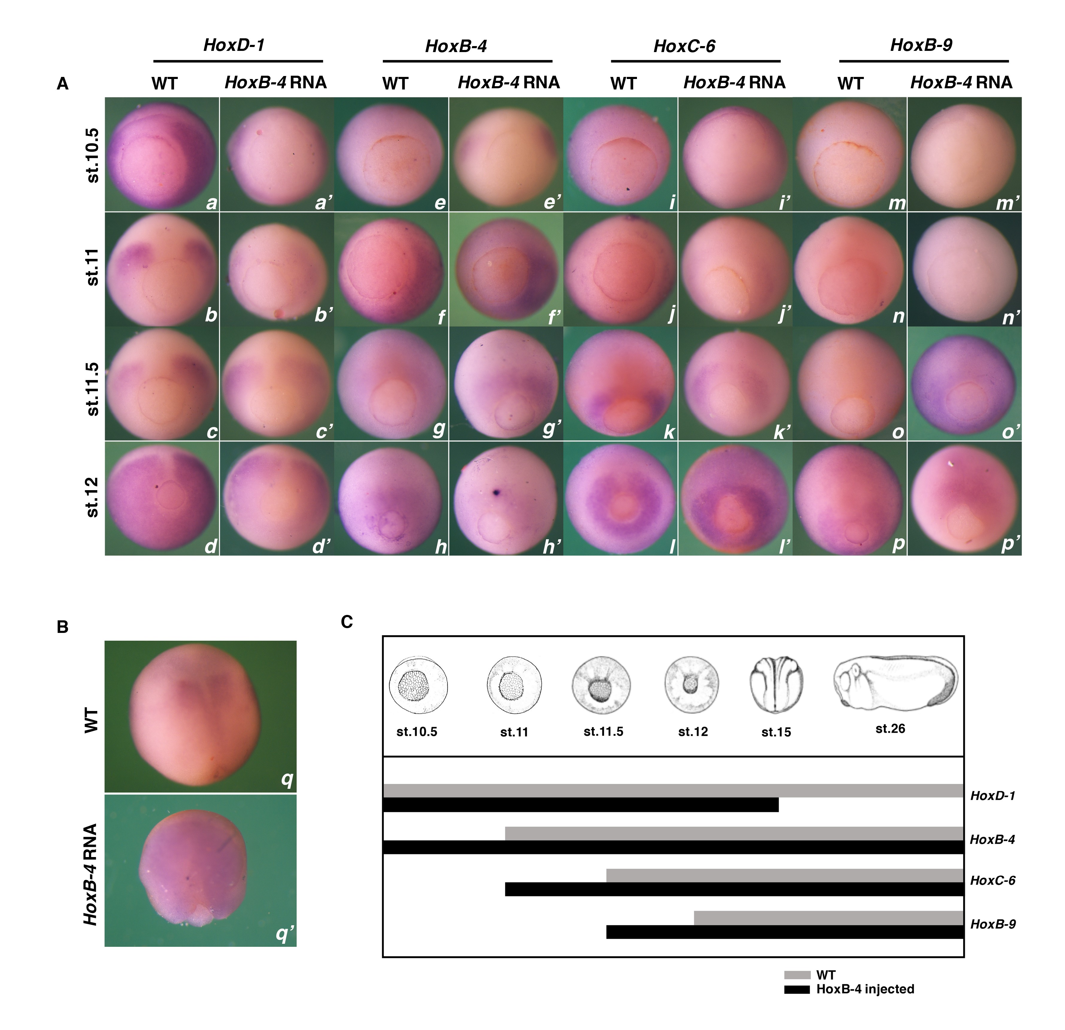 (A) WISH for the expression of HoxD-1 (a-d and a’-d’), HoxB-4 (e-h and e’-h’), HoxC-6 (i-l and i’-l’) and HoxB-9 (m-p and m’-p’) in WT and HoxB4GR (activated at st.8) injected embryos. In both WT (a-d) and HoxB-4GR injected embryos (a’-d’), the expression of HoxD-1 was detected from st.10.5 to st.12. However, the expression of HoxB-4, HoxC-6 and HoxB-9 were detectable from st.10.5 (e’, n = 5/9), st.11 (j’, n = 7/11) and st.11.5 (o’, n = 5/8) respectively, whereas their endogenous expression started from st.11 (f), st.11.5 (k) and st.12 (p), respectively. (B) WISH for HoxD-1 expression at st.15 in WT (q) and HoxB-4GR injected (q’, n = 4/7) embryos. (C) Schematic showing dynamic expression of HoxD-1, HoxB-4, HoxC-6 and HoxB-9 in WT and HoxB-4GR injected embryos.