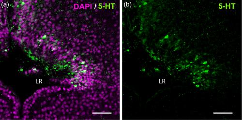 Figure 2. Open in figure viewer 5-HT+ CSF-c cells in the Xenopus PVO. The laterally extended hypothalamic recess (lateral recess; LR) is visualized with DAPI staining (magenta) from a frontal section (midline to the left). CSF-c cells immunolabeled for 5-HT (green) are located medially in the rostral hypothalamus and laterally in the caudal hypothalamus. (a) depicts both DAPI and 5-HT stainings, while (b) shows 5-HT only (same picture). In the projection of confocal images (15 µm), the rostromedial and caudolateral CSF-c cells look continuous. Scale barâ=â50 µm |