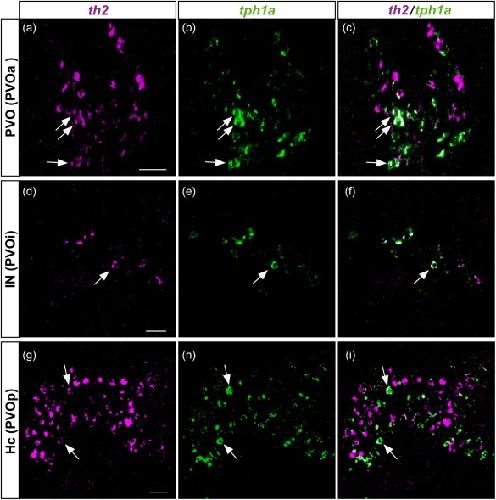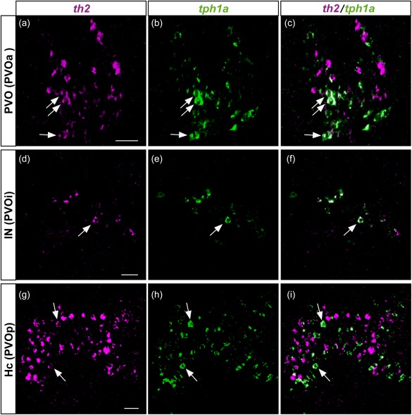 Figure 8. Colocalization of th2 and tph1a in the three CSF‐c cell populations of zebrafish. Frontal sections of the adult zebrafish brain showing the three CSF‐c cell populations, PVO (a–c), IN (d–f), and Hc (g–i), which are also known as PVOa, PVOi, and PVOp, respectively. Single confocal planes show that th2 (magenta) and tph1a (green) are found in the same cell population, and some cells coexpress both of them (arrows). Scale bar = 20 µm |