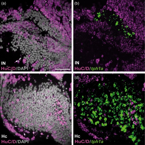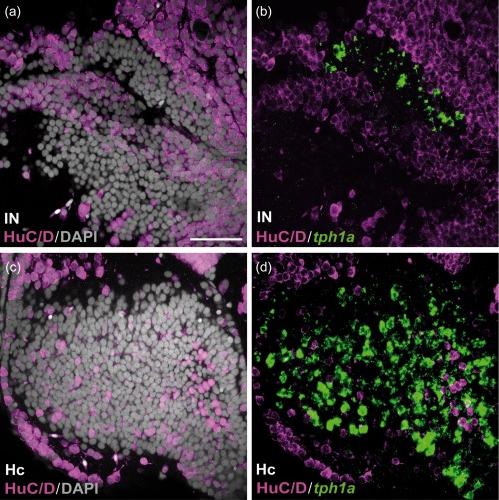 Figure 11. HuC/D immunoreactivity in the caudal CSF‐c cell populations in zebrafish. Frontal sections of the zebrafish IN (a and b) and Hc (c and d), with the midline to the left. Gray represents DAPI staining. The tph1a + CSF‐c cells (green) are negative for HuC/D (magenta). Scale bar = 50 µm (applies to a, b, c, d) |