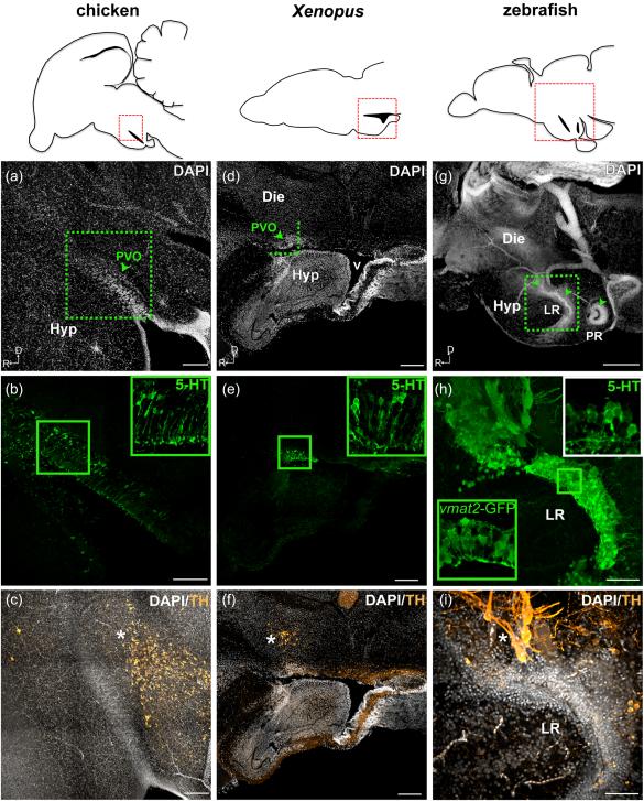 Figure 1. Open in figure viewer Monoaminergic CSF-c cells of chicken, Xenopus, and zebrafish in relation to the organization of the hypothalamic ventricle. Schematic drawings of sagittal sections of chicken, Xenopus, and zebrafish brains are shown in the top panels, and for each species, micrographs of the red squared areas are shown below (aâc for chicken, dâf for Xenopus, and gâi for zebrafish). DAPI staining (gray) delineates the recesses of the hypothalamic ventricle. Confocal images (Z-projectionâ=â10 µm) with higher magnification obtained from the area depicted in (a) (dashed green square) show 5-HT+ CSF-c cells (green) aligned along the dorsal side of the hypothalamic recess (b; inset at higher magnification). TH immunoreactive cells (orange) are not observed within the PVO (arrowhead), but are abundant in the area dorsocaudal to it (c; asterisk). In the Xenopus sagittal section close to the midline, PVO (d; arrowhead) is observed at the anterior edge of the large ventricle (v). The PVO is visualized with 5-HT+ CSF-c cells (e; green; inset at higher magnification). TH immunoreactive cells (orange) are observed dorsal to the PVO (f; asterisk). In zebrafish, three CSF-c cell populations (locations indicated by arrowheads in g) are located around two hypothalamic recesses. The two anterior CSF-c cell populations are located in front of and around the lateral recess (LR), while the posterior population surrounds the posterior recess (PR). Higher magnification of the squared area in (g) is shown in (h) and (i) (Z-projectionâ=â10 µm). CSF-c cells revealed by the expression of GFP in the enhancer trap transgenic line ETvmat2:GFP (vmat2-GFP; green inset) are lined along the ventricular zone (h). The white inset in (h) shows the 5-HT labeling in the same area (the image is taken from a different sample). TH immunoreactive cells (orange) are found dorsal to the LR (i; asterisk). Dâ=âdorsal; Dieâ=âdiencephalon; Hypâ=âhypothalamus; LRâ=âlateral recess; PRâ=âposterior recess; PVOâ=âparaventricular organ; Râ=ârostral; vâ=âventricle. Scale barâ=â200 µm in (aâg); 50 µm in (h, i) |