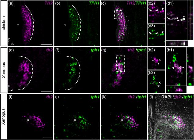 Figure 7. Colocalization of TH2 and TPH1 in the PVO of chicken and Xenopus. Frontal sections obtained from the PVO of chicken (aâd) and Xenopus (eâl) are shown. TH2 (a; magenta) and TPH1 (b; green) transcripts are observed in the same region of the chicken PVO, and some CSF-c cells coexpress both genes (c, d; white). The area depicted by a dashed rectangle in (c) is shown in (d1âd3) at higher magnification. Optical sectioning by confocal microscopy shows that TH2 (d2) and TPH1 (d3) are expressed in the soma (arrowheads) and in the processes of CSF-contacting cells (arrow). Orthogonal views of optical sections confirm the overlap of TH2 and TPH1 signals. In Xenopus, th2 (e, i; magenta) and tph1 (f, j; green) are expressed both in the rostromedial (eâh) and the caudolateral (iâl) parts of the PVO. Some CSF-c cells coexpress both genes (g, k). The coexpression is confirmed by orthogonal views of optical sections (h1) of the area depicted by a dashed rectangle in (g), showing that th2 (h2) and tph1 (h3) are colocalized in the same cells (arrowheads). Dâ=âdorsal; Lâ=âlateral; LRâ=âlateral recess; vâ=âventricle. Scale barâ=â100 µm in (a) (applies to a, b, c) and in (e) (applies to e, f, g); 50 µm in (i) (applies to i, j, k, l) |