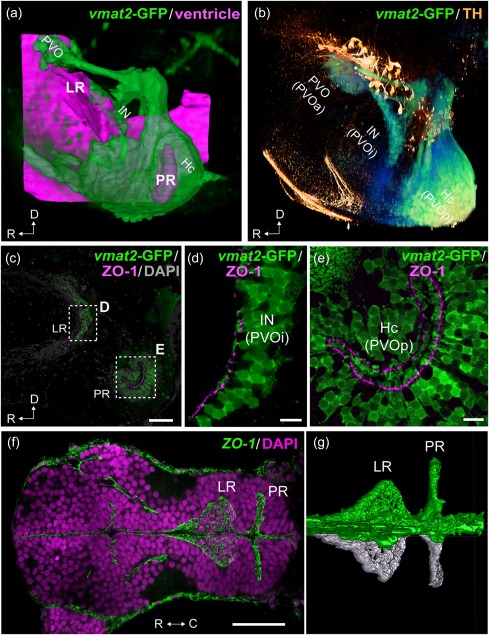 Figure 3. Organization of the two hypothalamic recesses in zebrafish. The hypothalamic area of adult (a–e; sagittal view) and embryonic (f, g; horizontal view) zebrafish brains are shown. The anterior is to the left in all figures. 3D visualization of the images of (a) and (b) are shown in the Supporting Information Figures S1 and S2 respectively. (a) The three vmat2‐GFP CSF‐c cells (green; PVO, IN, and Hc) are organized around the two hypothalamic recesses, namely the lateral recess (LR) and the posterior recess (PR). The CSF‐c cells (green) are visualized using an enhancer trap vmat2:GFP zebrafish line, and the ventricular zone (magenta) is reconstructed from ventricular surfaces delineated by DiI staining. (b) Immunolabeling for vmat2‐GFP (green) and TH (orange). Prominent TH‐immunopositive cells (orange) are found dorsal to the CSF‐c cells populations (green): PVO, IN, and Hc, which are alternatively named PVOa, PVOi, and PVOp. (c–e) Adult hypothalamic recesses double labeled for vmat2‐GFP and ZO‐1. The areas delimited by dashed rectangles in (c) are shown in (d) and (e), which demonstrate the end feet of the process of CSF‐c cells bathing in the ventricle. (f, g) The ZO‐1 immunolabeling in the developing brain (48 hr postfertilization), demonstrating that the LR and PR are separate ventricular extension from early embryonic stages. (g) shows 3D semiautomatic segmentation of the ZO‐1 immunolabeling in the LR and PR shown in (f). The right hemisphere and the midline are visualized in green, while the left hemisphere is visualized in white, to highlight the intricate ventricular organization. C = caudal; D = dorsal; Hc = caudal zone of periventricular hypothalamus; IN = intermediate nucleus of hypothalamus; LR = lateral recess; PR = posterior recess; PVO = paraventricular organ; PVOa = anterior paraventricular organ; PVOi = intermediate paraventricular organ; PVOp = posterior paraventricular organ; R = rostral. Scale bars = 50 µm in (c) and (f); 10 µm in (d) and (e) |