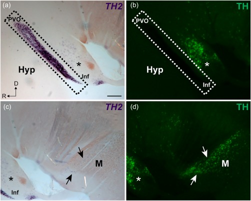 Figure 5. Double labeling for TH2 nonfluorescent in situ hybridization and TH immunofluorescence in chicken. A sagittal section of chicken brain showing TH2 transcripts (purple) and TH immunoreactivity (green) in the hypothalamic (a, b) and mesencephalic (c, d) areas. TH2 transcripts are abundant in the PVO (a; dashed area) and scarce in a cell population corresponding to A11 (a; asterisk). In contrast, TH immunoreactive cells are abundant in the A11 cell group (b; asterisk), while they are absent in the PVO (b; dashed area). The mesencephalic TH immunoreactive cells also express TH2 (c; arrows), but compared to the TH immunoreactivity (d; arrows), the TH2 + signal is very low. D = dorsal; Hyp = hypothalamus; Inf = infundibulum; M = mesencephalon; R = rostral. Scale bar = 200 µm in (a) (applies to a, b, c, d) |