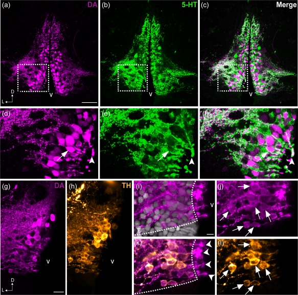 Figure 9. Colocalization of DA and 5‐HT in the PVO cells of zebrafish. Frontal sections of the anterior PVO (PVOa) in adult zebrafish demonstrate that CSF‐c cells are immunoreactive to DA (magenta; a, d) and to 5‐HT (green; b, e). The areas in dashed rectangles in (a), (b), and (c) are shown at higher magnification (Z‐projection = 5 µm) in (d), (e), and (f) respectively. Both monoamines were observed in a few cell bodies (arrow in f) and endfeet (arrowhead in f). In teleosts, some of the DA+ CSF‐c cells (g) are also immunoreactive for TH (h; orange). Higher magnification images of the PVO are shown in (i–l). In CSF‐c cells, intense DA immunoreactivity is present in the cell soma (j; arrows), processes, and the endfeet contacting the ventricle (k; arrowheads). In contrast, intense TH immunoreactivity is mostly observed in the soma and processes (l; arrows), but not in the endfeet. D = dorsal; L = lateral; v = ventricle. Scale bar = 50 µm in (a) (applies to a, b, c); 200 µm in (g) (applies to g, h); 100 µm in (i) (applies to i, j, k, l) |