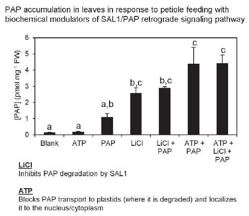 Figure 2—figure supplement 1. Exogenous PAP feeding to plant leaves via epidermal leaf peels or petiole feeding.Petiole feeding of PAP for 1 hr results in accumulation of PAP in leaves. Levels were significantly enhanced by co-application with LiCl, an inhibitor of the PAP catabolic enzyme SAL1, or with ATP, which outcompetes PAP for transport into plastids where PAP is degraded. ATP also allows PAP to be localized to its sites of action, the nucleus/cytoplasm. Results averaged from three individual plants ± SEM. a, b and c represent significant differences (p<0.05).DOI: http://dx.doi.org/10.7554/eLife.23361.007 |