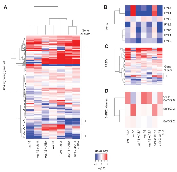 Figure 3—figure supplement 2. Changes in gene expression of ABA receptors, PP2Cs and SnRKs in response to ABA.Hierarchical clustering of the expression of (A) ABA signalling gene sets in wild type, ost1-2, sal1-8 and ost1-2 sal1-8 ± ABA; (B) seven PYLs; (B) 52 PP2C genes; and (C) three SnRK2 kinases. For all hierarchical clustering analyses performed, gene expression was compared to wild type untreated of the four genotypes ± ABA. Scale = log2, blue lower and red higher expression. The scale has been condensed such that the red and blue colours at the end of the scale encompass all fold-changes greater or equal to 2, or less than or equal to 0.5, respectively.DOI: http://dx.doi.org/10.7554/eLife.23361.010 |