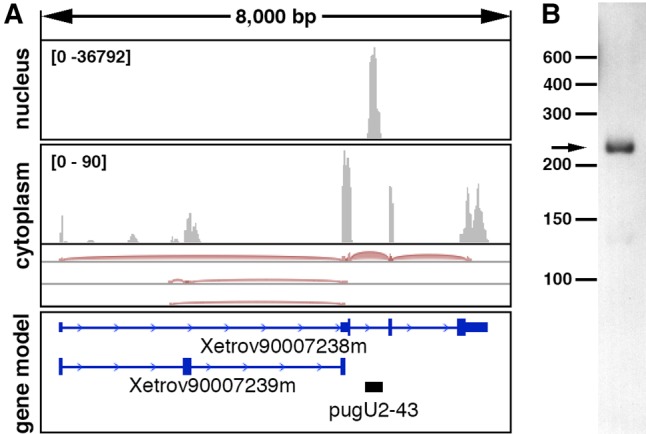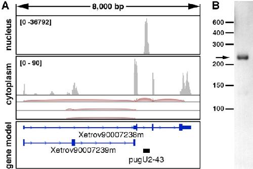 FIGURE 3. Expression of the novel Xenopus pugU2-43 RNA detected by RNA deep-sequencing of oocyte nuclear and cytoplasmic RNA (A) and by Northern blot analysis of X. tropicalis liver RNA (B). (A) IGV browser view of RNA deep-sequencing reads (PRJNA302326) previously generated in our laboratory (Talhouarne and Gall 2014) and aligned to the X. tropicalis 9.0 genome. The black bar in the gene model panel indicates pugU2-43 RNA newly identified in the nuclear fraction.