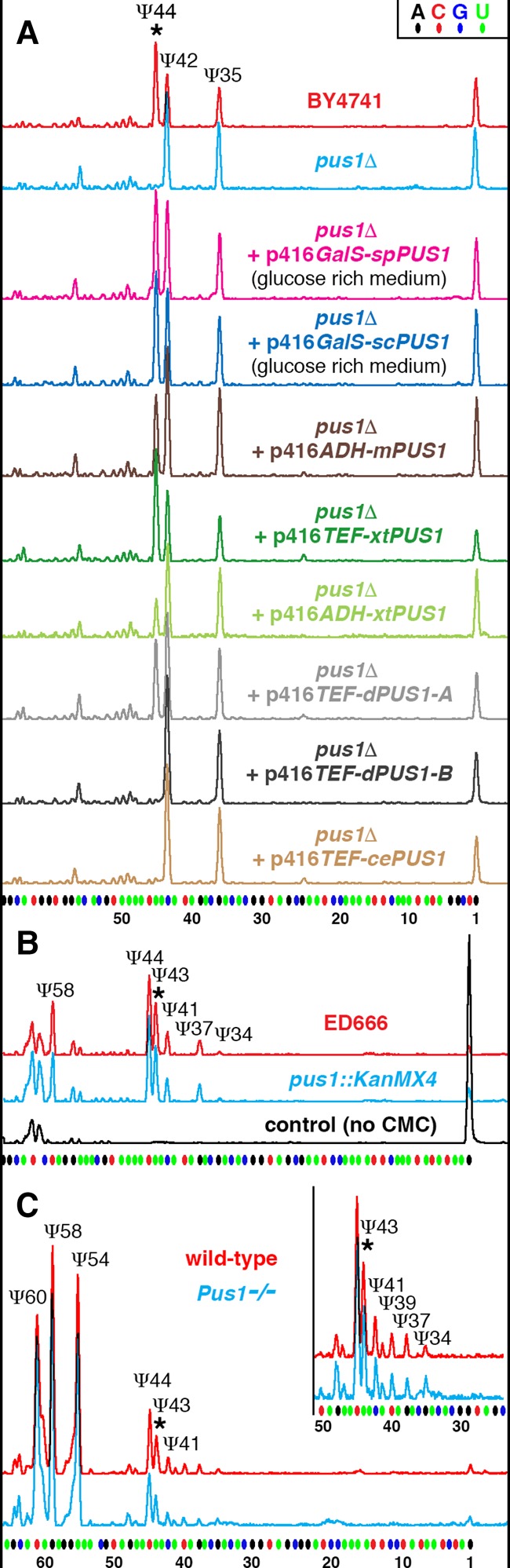 Pus1p enzymatic activity on U2 snRNA in different species. (A) S. cerevisiae U2 snRNA is normally pseudouridylated at positions 35, 42, and 44 (wild-type BY4741 strain, red trace). In a Pus1p-deficient S. cerevisiae strain, the pseudouridine at position 44 is missing (pus1Δ, blue trace). Pus1p from fission yeast S. pombe (spPus1p, magenta trace) when expressed in S. cerevisiae pus1Δ strain modifies yeast U2 snRNA as efficiently as S. cerevisiae Pus1p (scPus1p, dark blue trace). Mouse, Xenopus, and Drosophila Pus1p enzymes can rescue pseudouridylation at position 44 in yeast S. cerevisiae pus1Δ strain, yet a much higher level of expression is required (mPus1p, dark brown trace; xtPus1p, green traces; dPus1p-A/CG4159-PA, gray trace). Compare the efficiency of pseudouridylation when Xenopus Pus1p is expressed from plasmids with different promoter activities: ADH promoter (light green trace) and TEF promoter (dark green trace). Pus1p from C. elegans and the longer isoform of Drosophila Pus1p could not modify yeast U2 snRNA even when overexpressed (cePus1p, light brown trace; dPus1p-B/CG4159-PB, black trace). (B) U2 snRNA pseudouridylation mapping in S. pombe wild-type (ED666, red trace) and pus1Δ (pus1::KanMX4, blue trace) strains. U2 snRNA from the pus1Δ strain is modified at all the normal positions, including position 43. (C) U2 snRNA pseudouridylation mapping in wild-type (red trace) and Pus1 knockout (Pus1−/−, blue trace) mice. Inset in C zooms in on the branch point recognition region; note no differences between wild-type and mutant strains in their U2 snRNA modification patterns. Stars indicate peaks corresponding to pseudouridine at position 44 in S. cerevisiae U2 snRNA or equivalent position 43 in S. pombe and mouse U2 snRNA.