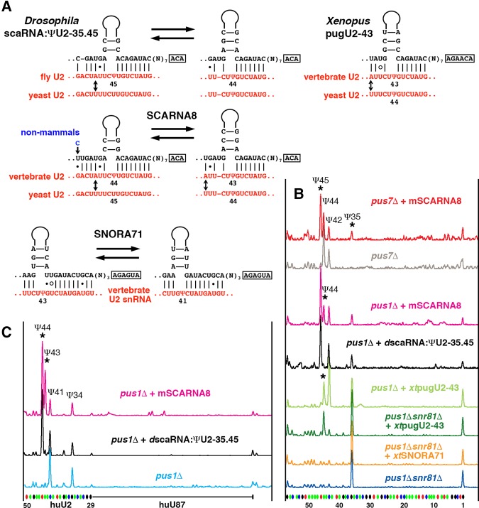 FIGURE 2. Vertebrate guide RNAs for U2 snRNA pseudouridylation at position 43. (A) Predicted base-pairing with the U2 snRNA branch point recognition region. Arrows indicate nucleotides in U2 snRNA that differ between yeast and higher eukaryotes. (B,C) Testing guide RNA activities in a yeast cell system. (B) Modification of yeast U2 snRNA mediated by Drosophila scaRNA:ΨU2-35.45, mouse SCARNA8, Xenopus SNORA71, and pugU2-43 guide RNAs expressed in the pus7Δ, pus1Δ, and pus1Δsnr81Δ strains. (C) Modification of the vertebrate branch point recognition region (nucleotides 29–52) inserted into an artificial U87-derived RNA, mediated by mouse SCARNA8 and Drosophila scaRNA:ΨU2-35.45 guide RNAs expressed in the pus1Δ strain. Stars indicate the guide RNA-induced modifications.