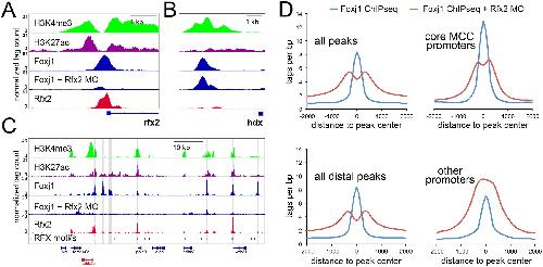 Interactions between Foxj1 and Rfx2 (A) Venn diagram at the top represents all peaks (fixed width) bound by Foxj1 and Rfx2 identified with ChIPseq, in terms of their overlap. The pie charts shown below illustrate where Foxj1 and Rfx2 binding occurs in relation to annotated genomic features depending on whether they bind together or alone. (B) Foxj1 ChIPseq peaks were subdivided into those located near promoters (< 1 kb to the TSS) or at more distal sites (> 1 kb to the TSS) and then analyzed for the frequency of Rfx or Fox binding motifs. (C) Shown is the distribution of Rfx2 and Foxj1 peaks relative to TAD boundaries (left panel), and the distribution of Rfx2 and Foxj1 sequencing tags relative to TAD boundaries (right panel).