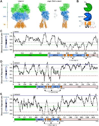 Fig 1. Intolerance analysis of genetic variation across functional domains of GluN1, GluN2A and GluN2B.A, Ribbon structure of homology model of a tetrameric NMDAR and a single GluN subunit [10,12]. B, A cartoon illustrating the domain arrangement of an individual GluN subunit. ATD—amino terminal domain (in GREEN), S1 and S2 –first and second polypeptide sequences comprising the agonist binding domain (ABD, in BLUE), linker regions (S1-M1 linker, M3-S2 linker, and S2-M4 linker; in GRAY), M1, M3, and M4 –transmembrane domains (TM, in ORANGE), M2 –re-entrant pore loop (in ORANGE), and CTD—carboxy-terminal domain (in PINK). C, GRIN1; D, GRIN2A; E, GRIN2B: Sliding window OE-ratio estimates (black full line), Neutrality expected OE-ratio estimate (blue full line), Median OE-ratio for the gene (dark grey dashed line), 25th percentile of OE-ratio (green dashed line), 5th percentile of OE-ratio (red dashed line).