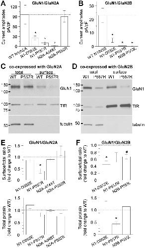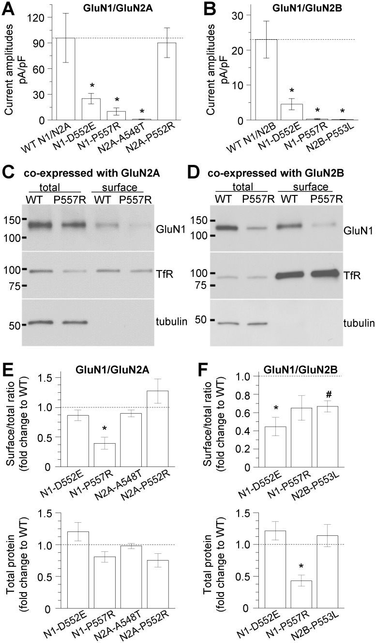 Fig 3. Pre-M1 mutations affect current amplitudes and NMDAR surface expression.A,B, Summary of current amplitudes evoked by 1 mM glutamate and 100 μM glycine in whole cell voltage clamp recordings from HEK293 cells expressing human NMDARs (holding at -60 mV). *p < 0.05, see Table 3 and S4 Table for statistical analyses. The graph legends refer to GluN1 as N1 and GluN2 as N2. C-F, The surface proteins of HEK293 cells transiently expressing WT or mutated human NMDARs were labeled with biotin and pulled down with avidin-conjugated beads. The total and surface protein fractions were immunoblotted for GluN1, GluN2A or GluN2B, transferrin receptor (TfR), and tubulin. Representative blots are shown for HEK293 cells expressing GluN1/GluN2A and GluN1-P557R/GluN2A (C), and GluN1/GluN2B and GluN1-P557R/GluN2B (D). Chemiluminescence signals were quantified by densitometry, and the ratio of surface-to-total protein and total protein levels for each mutant were plotted as the fold-change from WT (dashed line). Total protein levels were normalized to tubulin levels. The data were analyzed by one-way ANOVA and paired t-tests between respective mutant and WT controls, with Benjamini-Hochberg correction for multiple comparisons (E, GluN1/GluN2A surface/total: F(7,28) = 5.081, p < 0.001; *p = 0.019; GluN1-D552E/GluN2A p = 0.475; 2A-A548T p = 0.453; GluN1/GluN2A-P552R p = 0.404; GluN1/GluN2A total (lower panel): F(7,28) = 2.050, p = 0.084; F, GluN1/GluN2B surface/total: F(5,28) = 7.585, p < 0.001; *p = 0.025; #p = 0.018; GluN1-P557R/GluN2B p = 0.102; GluN1/GluN2B total (lower panel): F(5,28) = 4.903, p = 0.002; *p = 0.018; GluN1-D552E/GluN2B p = 0.473; GluN1/GluN2B-P553L p = 0.649). See also S1 Fig.