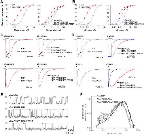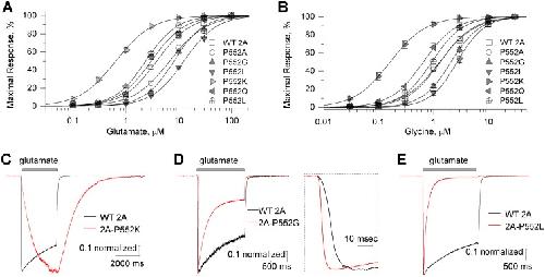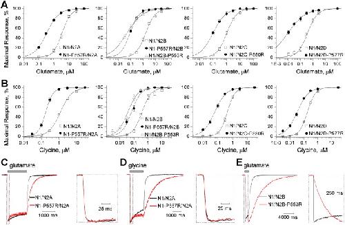Fig 5. Conserved effects of the Pro552Arg mutation across GluN2 subunits.A,B, Composite concentration-response curves of glutamate in the presence of 100 μM glycine (A) and glycine in the presence of 100 μM glutamate (B) for human GluN1-P557R/GluN2A, GluN1-P557R/GluN2B, GluN1/GluN2B-P553R, and rat GluN1/GluN2C-P550R, and GluN1/GluN2D-P577R. The graph legends refer to GluN1 as N1 and GluN2 as N2. Fitted EC50 values are summarized in Tables 3 and 5. C,D, human GluN1-P557R/GluN2A significantly prolongs deactivation time course after removal of glutamate (C) or removal of glycine (D) on transfected HEK293 cells, but does not slow the rise time when the receptors were activated by the agonists. E, GluN1/GluN2B-P553R significantly slows rise time and prolongs deactivation time course. Fitted parameters describing the response time course are given in Table 6.