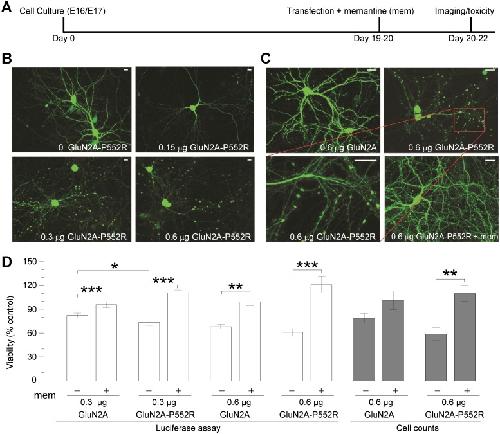 Fig 8. Neurotoxic consequences of GluN2A-P552R expression and rescue pharmacology.A, Schematic of experimental timeline indicates the relative dates of neuronal cell culture from embryonic day 16/17 (E16/17), transfection along with memantine/vehicle treatment, and toxicity studies (luciferase assays, cell counts, and confocal imaging). B, Confocal images of cortical neurons transfected with a GFP-expressing construct, with various concentrations of the human GluN2A-P552R-expressing plasmid illustrate the cell morphology. Images were acquired 24 h post-transfection at 20× magnification (scale bars 10 μm). C, Confocal images of cortical neurons transfected with GFP-expressing construct with either 0.6 μg cDNA per well (40% of total transfection cDNA) of WT GluN2A or GluN2A-P552R, the latter in the absence or presence of memantine (50 μM). Images were acquired 24 h post-transfection at 20× magnification, with the exception of the bottom left panel (40×), which highlights GluN2A-P552R-induced dendritic swelling and blebs (scale bar 10 μm). D, The mean cell viability values are shown as a percent of control. Luciferase assays: neuronal cultures were transfected with GFP-N1 plasmid (0.525 μg or 0.825 μg per well) luciferase cDNA (0.375 μg/well) for cell viability assaying, with varied concentrations (0.3 μg or 0.6 μg per well) of pCIneo-vector, WT GluN2A, or GluN2A-P552R cDNA (1.5 μg total DNA per well). Each transfection condition was performed in pairs, either supplemented with vehicle (–) or memantine (20 μM for 0.3 μg; 50 μM for 0.6 μg) treatment (+). Luciferase assays were performed 48 h following transfection and treatment. Experiments were performed in quadruplicate, and independent experiments were repeated (0.3 μg cDNA, n = 7; 0.6 μg cDNA, n = 8). Each condition was normalized to its relevant vector-transfected group to obtain relative viability values, expressed as % control. Data are mean ± SEM of viability (% control) for each condition (ANOVA/Bonferroni; *p <0.05, **p < 0.01, ***p < 0.001). Cell counts: Neuronal cultures were transfected with GFP-N1 plasmid for cell visualization, with either 0.6 μg pCIneo including vector, WT GluN2A, or GluN2A-P552R cDNA (40% of total transfection cDNA). Each transfection condition was performed in duplicate. Cell counts were performed 48 h post-transfection (Methods). Data are mean ± SEM of viability (% control) for each condition in 6 independent experiments. ANOVA/Bonferroni (**p < 0.01). See S9 Table for statistics.