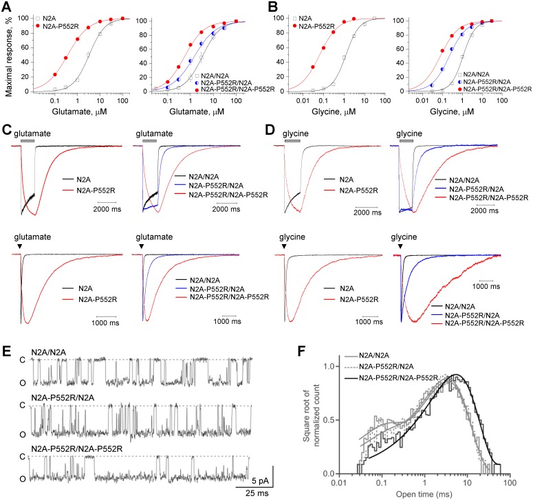 Fig 4. GluN2A-P552R increases agonist potency and alters the NMDAR response time course.A, Steady-state concentration-response relationship for glutamate activation of human di-heteromeric (left panel) GluN1/GluN2A receptors and rat tri-heteromeric GluN1/GluN2A (right panel) containing 0, 1, or 2 copies of GluN2A-P552R receptors (labelled N2A/N2A, N2A/N2A-P552R, N2A-P552/N2A-P552R) expressed in Xenopus oocytes with 100 μM glycine present in all solutions. B, Concentration-effect relationship for glycine activation of human di-heteromeric (left panel) and rat tri-heteromeric (right panel) GluN1/GluN2A and GluN1/GluN2A-P552R receptors with 100 μM glutamate present in all solutions. C, Whole cell voltage clamp recording of di-heteromeric (left panels) and tri-heteromeric (right panels) GluN1/GluN2A-P552R receptor responses to rapid application of long (1.5 sec, upper panels) and brief (5 ms, lower panels) application of 1000 μM glutamate; saturating glycine (30 μM) was present in all of the solutions. Fitted parameters describing the time course of the response to long glutamate application are given in Table 4. The rise time and weighted tau describing the response to brief 5 ms application of glutamate were 7 ± 0.7 and 42 ± 4.3 ms for WT GluN1/GluN2A and 146 ± 20 and 689 ± 49 ms for diheteromeric GluN1/GluN2A-P552R, respectively (p < 0.0001 for both, t-test, n = 7–9). The rise time and weighted tau for receptors with 0, 1, or 2 copies of GluN2A-P552R were 8 ± 1and 38 ± 3.4 ms, 9 ± 1 and 201 ± 30 ms, 210 ± 16 and 1283 ± 153 ms, respectively (n = 8). D, Whole cell voltage clamp recording of di-heteromeric (left panels) and tri-heteromeric (right panels) GluN1/GluN2A-P552R receptor responses to rapid application (1.5 sec) of glycine; saturating glutamate (100 μM) was present in all of the solutions. See Table 4 for all mean ± s.e.m. values and S5 Table for statistical analyses for panels A-D. E, Single channel currents were recorded from HEK293 Tet-On cells selectively expressing GluN1/GluN2A receptors with 0, 1 or 2 copies of GluN2A-P552R. Currents were recorded in the outside-out configuration at -80 mV. The closed state (C) is indicated by a dashed line and openings are downwards deflections of current and the open state is indicated by an O. F, Normalized open time histograms from the three current recordings shown in (E) reveal an increase in the slower open time component of GluN1/GluN2A-P552R. Smooth lines show fitted dual component exponential functions. See also S2 Fig.