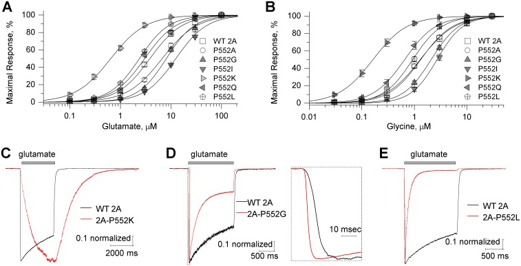 Fig 6. Assessment of alternative Pro552 substitutions in GluN2A.A,B, the composite glutamate (in the presence of 100 μM glycine) and glycine (in the presence of 100 μM glutamate) concentration-response curves of GluN2A- P552A, P552G, P552I, P552K, P552Q, P552L constructs. Error bars are SEM and shown when larger than symbol. C,D,E, The response time courses are shown of GluN1/GluN2A(P552K), GluN1/GluN2A(P552G), and GluN1/GluN2A(P552L) receptors activated by rapid application of 100 μM glutamate; 100 μM glycine was present in all solutions. For panel D the rise time is expanded as an inset. The data (mean ± SEM) are given in Table 7.