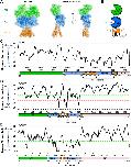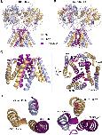 Fig 9. Potential interaction between the pre-M1 and M3 helices.A,B, Ribbon structures of the GluN1/GluN2A (A) and GluN1/GluN2B (B) receptors without the amino terminal domain is shown. GluN1 is tan and GluN2 is light blue; regions with an OE-ratio below the 5th percentile are colored purple, and indicate the regions under the strongest purifying selection. C, Side and top down view of the pore forming elements M1, M3, M4 in GluN1/GluN2A receptors colored as in (A), with regions of purifying selection shown in purple. D, Expanded view of the pre-M1 helix for GluN1 (left panel) and for GluN2A (right panel).