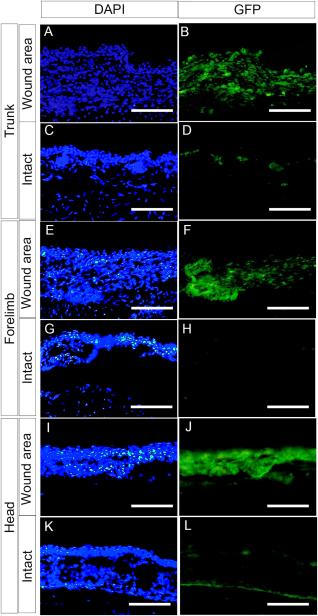 The prx1 enhancer was activated in all trunk, forelimb, and head-skin wound areas 4 days after skin excision in Mprx1-GFP froglets. Sections of regenerating and intact control skin were labeled with an anti-GFP antibody; nuclei were stained with DAPI. Immunostaining of regenerating skin around the original wound area (A,B,E,F,I,J) and intact (control) skin away from the wound area (C,D,G,H,K,L) in the same froglet. Little GFP was detected in the intact control skin (D,H,L), but robust staining for GFP was detected under the wound epidermis (B,F,J). Skin surface is up. Five of five and four of four individuals showed basically the same results in the trunk and forelimb, respectively. Two of four individuals showed robust staining for GFP in wound area of the head (J), but the rest showed relatively weaker staining for GFP. Bar = 100 µm.