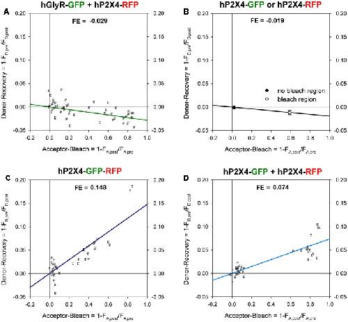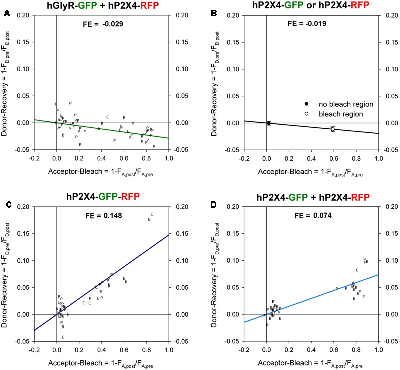 FIGURE 2. Förster resonance energy transfer (FRET) between GFP- and RFP -labeled P2XR subunits measured with donor recovery by acceptor photobleaching. Measurements were made at the oocyte pole adjacent to the bottom of the recording chamber (P) or at the equator (E) of the oocytes, as shown in Figure 1. The degree of donor recovery was plotted against the degree of acceptor bleaching. FRET efficiency (FE) was obtained by extrapolating the linear regression line to complete acceptor bleaching (right hand y-axis). (A) Negative control: coexpression of C-terminally RFP-labeled hP2X4 with SP-GFP-GLYRA1. (B) In oocytes expressing either hP2X4-GFP or hP2X4-RFP, the mean changes in the donor (donor recovery) and acceptor fluorescence (acceptor bleach) were measured at bleached versus non-bleached areas. The decrease of the donor fluorescence in regions of acceptor bleach indicates a bleaching effect of the acceptor excitation light and leads to calculation of negative FE values. (C) Positive control: P2X4 protein with a C-terminal tandem GFP-RFP label. (D) Coexpression of C-terminally GFP- and RFP-labeled hP2X4 constructs. Mean fluorescence values were calculated from 50â60 regions of interests (ROIs) in 5â10 oocytes.