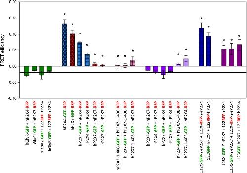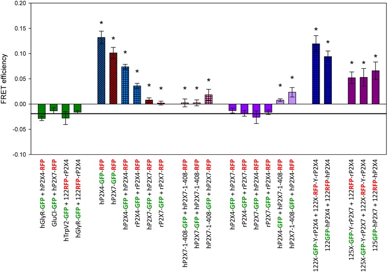 FIGURE 3. Förster resonance energy transfer measurement of P2X4 and P2X7 subunit interactions. FRET efficiencies were calculated as described in Figure 2. Horizontal line represents GFP bleaching during acceptor bleaching leading to negative FE values of â0.019 (see Figure 2B). â, FRET efficiencies significantly larger than â0.019. Data are the means ± SEM from 12â20 oocytes. X and Y denote short, flexible linkers (-GAGA- and -AGAG-, respectively; single amino acid letter code) flanking the GFP or RFP moiety. The position of the fluorophore name indicates the position of the label in the P2X receptor fusion construct (i.e., P2X7-GFP indicates a C-terminal label). Bar colors: green = negative control, blue = P2X4 constructs, red = P2X7 constructs, pink = P2X4/P2X7 coexpression. Bar patterns: cross-hatched = tandem GFP-RFP label, checkered = positive controls.