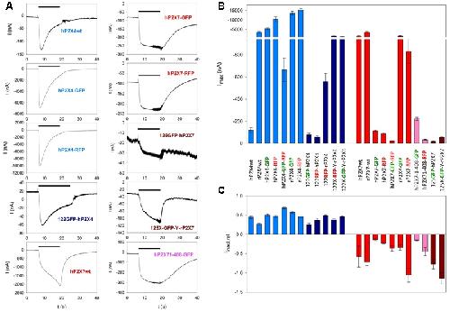 ???displayArticle.abstract??? P2X4 and P2X7 are members of the P2X receptor family, comprising seven isoforms (P2X1-P2X7) that form homo- and heterotrimeric non-specific cation channels gated by extracellular ATP. P2X4 and P2X7 are widely coexpressed, particularly in secretory epithelial cells and immune and inflammatory cells, and regulate inflammation and nociception. Although functional heteromerization has been established for P2X2 and P2X3 subunits expressed in sensory neurons, there are contradictory reports regarding a functional interaction between P2X4 and P2X7 subunits. To resolve this issue, we coexpressed P2X4 and P2X7 receptor subunits labeled with green (EGFP) and red (TagRFP) fluorescent proteins in Xenopus laevis oocytes and investigated a putative physical interaction between the fusion proteins by Förster resonance energy transfer (FRET). Coexpression of P2X4 and P2X7 subunits with EGFP and TagRFP located in the extracellular receptor domains led to significant FRET signals. Significant FRET signals were also measured between C-terminally fluorophore-labeled full-length P2X41-384 and C-terminally truncated fluorescent P2X71-408 subunits. We furthermore used the two-electrode voltage clamp technique to investigate whether human P2X4 and P2X7 receptors (hP2X4, hP2X7) functionally interact at the level of ATP-induced whole-cell currents. Concentration-response curves and effects of ivermectin (P2X4-potentiating drug) or BzATP (P2X7-specific agonist) were consistent with a model in which coexpressed hP2X4 and hP2X7 do not interact. Similarly, the effect of adding specific inhibitors of P2X4 (PSB-15417) or P2X7 (oATP, A438079) could be explained by a model in which only homomers exist, and that these are blocked by the respective antagonist. In conclusion, we show that P2X4 and P2X7 subunits can form heterotrimeric P2X4/P2X7 receptors. However, unlike observations for P2X2 and P2X3, coexpression of P2X4 and P2X7 subunits does not result in a novel electrophysiologically discriminable P2X receptor phenotype.