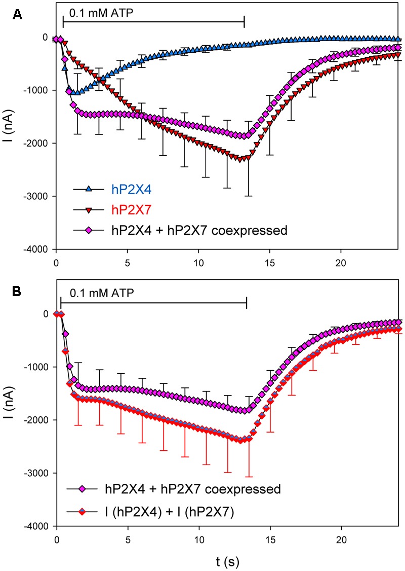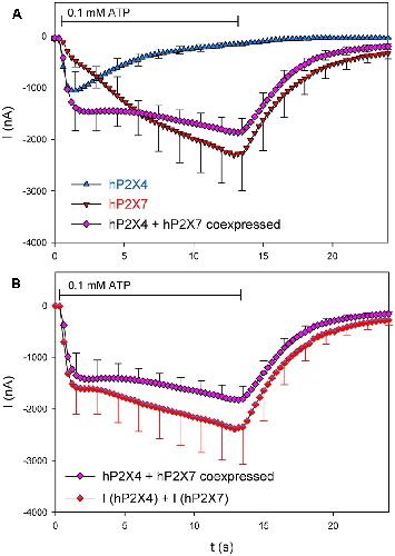 FIGURE 5. Kinetics of ion channel currents in hP2X4/hP2X7-coexpressing oocytes. Two-electrode voltage clamp measurements of currents in Xenopus oocytes expressing hP2X4 and hP2X7 receptors were elicited by the application of 0.1 mM ATP. (A) Mean current traces were recorded from oocytes expressing hP2X4 or hP2X7 subunits alone or together, as indicated. (B) Mean currents in oocytes coexpressing hP2X4 and hP2X7 were compared with the sum of those in oocytes expressing hP2X4 or hP2X7 alone. The mean current amplitudes were not significantly different at any time point, indicating that P2X4/P2X7 heteromers with distinct current kinetics are not formed. Data are the means ± SD from five oocytes at each time point.