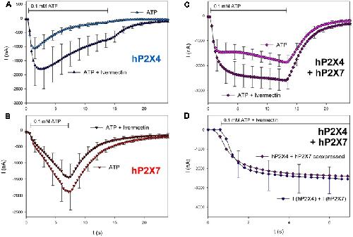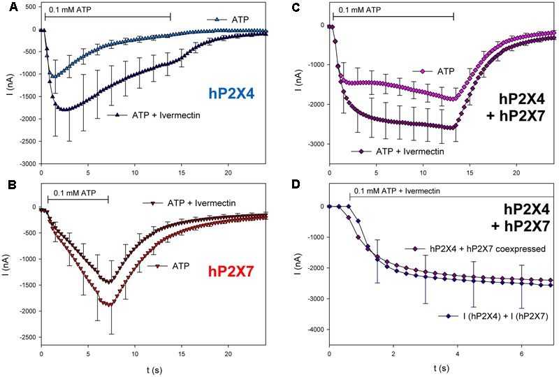FIGURE 7. Effect of ivermectin on ATP-induced currents of hP2X4/hP2X7-coexpressing oocytes. (AâC) Two-electrode voltage clamp measurements showing the effect of ivermectin (3 μM) on ATP-induced currents of oocytes expressing (A) hP2X4, (B) hP2X7, or (C) hP2X4 + hP2X7. Oocytes were incubated for 1 min with 3 μM ivermectin, and then with 3 μM ivermectin + 0.1 mM ATP. (D) Current amplitudes measured in P2X4/P2X7-coexpressing oocytes during ivermectin application were compared with the sum of the P2X4- and P2X7-dependent current amplitudes (as shown in parts A,B, respectively). Mean current amplitudes were not significantly different at any time point, indicating the lack of a distinct P2X4/P2X7 phenotype related to ivermectin. This may be explained by ivermectin affecting only homomeric P2X4 receptors. Data are the means ± SD from 4â6 oocytes.