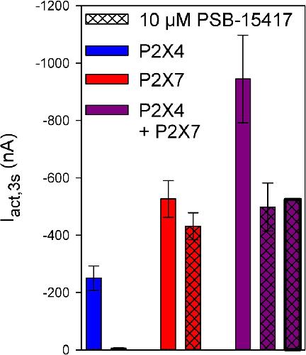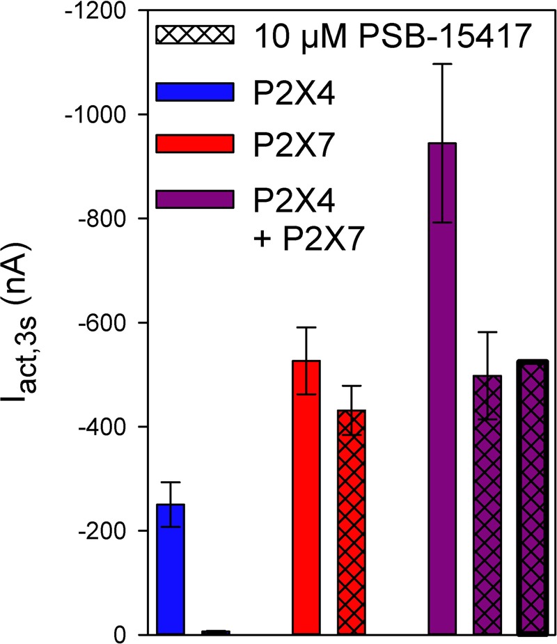 FIGURE 8. Effect of PSB-14517 on ATP-induced currents of hP2X4/hP2X7-coexpressing oocytes. Two-electrode voltage clamp measurements showing ATP-induced current amplitudes (Iact,3s) at 3 s after the application of 0.1 mM ATP. The theoretical current remaining after PSB-14517 application to hP2X4/hP2X7-expressing oocytes (rightmost column) was calculated as described in Section âResults.â The theoretical current amplitude was not significantly different from the measured value (next to rightmost column), indicating the lack of a distinct P2X4/P2X7 phenotype related to PSB-14517, which may be explained by PSB-14517 affecting only homomeric P2X4 receptors. Data are means ± SD from 4â11 oocytes.