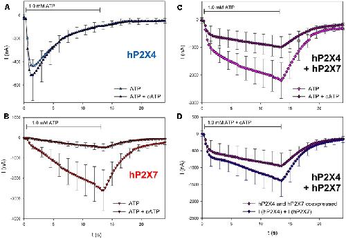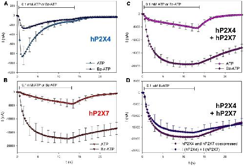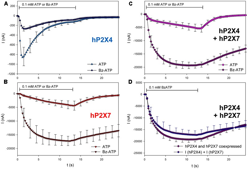 FIGURE 9. Effect of BzATP on ATP-induced currents of hP2X4/hP2X7-coexpressing oocytes. (AâC) Two-electrode voltage clamp measurements showing the effect of BzATP on ATP-induced currents of oocytes expressing (A) hP2X4, (B) hP2X7, or (C) hP2X4 + hP2X7. (D) BzATP-induced currents measured in P2X4/P2X7-coexpressing oocytes were compared with the sum of P2X4- and P2X7-dependent current amplitudes (shown in parts A,B, respectively). Mean current amplitudes were not significantly different at any time point, indicating the lack of a distinct P2X4/P2X7 phenotype related to BzATP stimulation. means ± SD from 5â6 oocytes.
