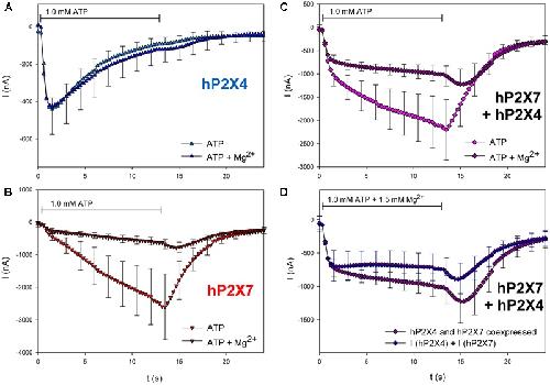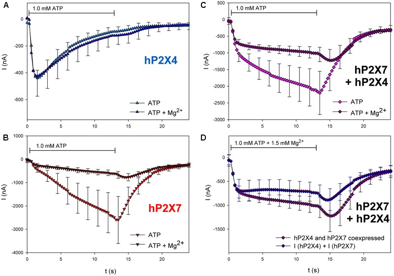 FIGURE 10. Effect of Mg2+ on ATP-induced currents of hP2X4/hP2X7-coexpressing oocytes. (AâC) Two-electrode voltage clamp measurements showing the effect of Mg2+ on ATP-induced currents of oocytes expressing (A) hP2X4, (B) hP2X7, or (C) hP2X4 + hP2X7. (D) Currents induced by the coapplication of ATP and 1.5 mM Mg2+ measured in P2X4/P2X7-coexpressing oocytes were compared with the sum of P2X4- and P2X7-dependent current amplitudes (shown in parts A,B, respectively). Mean current amplitudes were not significantly different at any time point, indicating the lack of a distinct P2X4/P2X7 phenotype related to Mg2+ inhibition. Data are means ± SD from 4â6 oocytes.