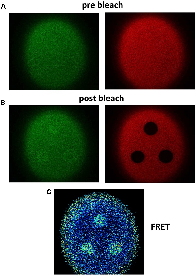 FIGURE 1. Fluorescence signals before and after acceptor photobleaching. Example of Donor (GFP) recovery after acceptor (RFP) photobleaching for the P2X4 construct with a C-terminal tandem GFP-RFP label. (A,B) Pre-bleaching (A) and post-bleaching (B) fluorescence images were obtained as described in the Methods section using a confocal laser scanning microscope. The slightly increasing GFP fluorescence is shown on the left side and the RFP fluorescence, which is strongly decreased due to application of the maximal RFP exciting light for 1 min on the right side. (C) The FRET signal was calculated pointwise using the microscope software in the same manner as shown in Figure 2. A strong FRET signal is measured in areas of RFP bleaching. Blue pixels indicate low and yellow pixels high FE.