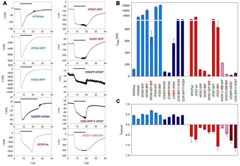 FIGURE 4. Functional testing of fluorescence-labeled P2X4 and P2X7 constructs by two-electrode voltage clamp measurements. (A) Examples of current traces in oocytes expressing wildtype P2X4 (P2X4wt) of P2X7 (P2X7wt) or different fluorescence-labeled P2X4 and P2X7 constructs, as indicated. The colors of the construct names relate to the colors of the bars in (B,C). (B) Maximal current amplitudes obtained during the application of 1 mM ATP for 6 s. (C) Kinetics of ion channel currents in oocytes expressing different labeled P2X constructs. The relative inactivation (Iinact,rel) was calculated as the amplitude of the current between 2 and 6 s after the application of 1 mM ATP normalized to the current amplitude at the 2 s time point. A decay in the current amplitude (Iinact,rel > 0) indicates desensitization (seen for all P2X4 constructs); an increase in current amplitude during this period (Iinact,rel < 0) was usually seen for P2X7 constructs and is of unknown origin. Bar colors: light blue = P2X4wt or C-terminally labeled constructs, dark blue = P2X4 constructs labeled within the extracelllar domain, red = P2X7wt or C-terminally labeled constructs, rosy = C-terminally truncated and labeled P2X7 constructs, dark red = P2X7 constructs labeled within the extracelllar domain. Data are the means ± SEM from 5â20 oocytes.