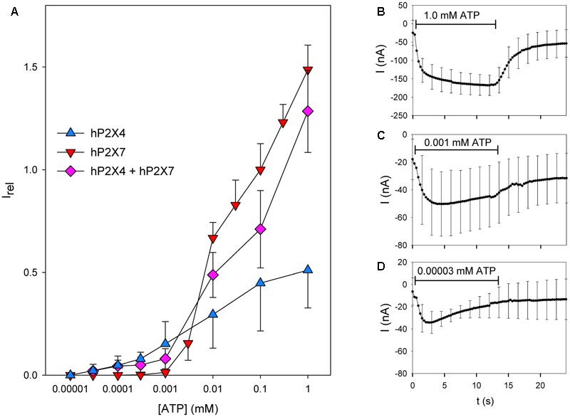FIGURE 6. Dependence on the ATP concentration of coexpressed hP2X4 and hP2X7 subunits. (A) Maximal current amplitudes in the presence of various ATP concentrations ([ATP]) were obtained by two-electrode voltage clamp measurements in oocytes expressing hP2X4 and/or hP2X7, as indicated. These amplitudes were measured during a 12 s lasting ATP application and normalized to the amplitude during a preceding application of 0.1 mM ATP to yield the relative current amplitude Irel. Irel values for hP2X4- or hP2X7-expressing oocytes are significantly different at all ATP concentrations. Current amplitudes of oocytes expressing hP2X4 + hP2X7 are significantly different from those of P2X7-expressing oocytes at 0.1â1 μM ATP and significantly different from those of P2X4-expressing oocytes at 0.01â1 mM ATP. Thus, the ATP concentrationâresponse curve for hP2X4/hP2X7-coexpressing oocytes is dominated by the hP2X4 component at low ATP concentrations and by the P2X7 component at high ATP concentrations, arguing against a distinct P2X4/P2X7 phenotype regarding the agonist sensitivity. (BâD) Averaged current traces of different oocytes expressing hP2X4 and hP2X7, elicited by the second ATP application at the indicated concentrations. Data are the means ± SD from 4â10 oocytes.
