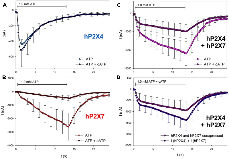 FIGURE 11. Effect of oATP on ATP-induced currents of hP2X4/hP2X7-coexpressing oocytes. (AâC) Two-electrode voltage clamp measurements showing the effect of 3 h preincubation in 0.3 mM oATP on ATP-induced currents of oocytes expressing (A) hP2X4, (B) hP2X7, or (C) hP2X4 + hP2X7. (D) Currents induced by ATP after oATP preincubation in P2X4/P2X7-coexpressing oocytes were compared with the sum of P2X4- and P2X7-dependent current amplitudes (shown in parts A,B, respectively). Mean current amplitudes were not significantly different at any time point, indicating the lack of a distinct P2X4/P2X7 phenotype related to oATP antagonism. Data are the means ± SD from 4â5 oocytes.