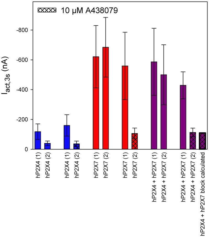 FIGURE 12. Effect of the P2X7 antagonist A438079 on ATP-induced currents of hP2X4/hP2X7-coexpressing oocytes. Two-electrode voltage clamp measurements of ATP-induced current amplitudes (Iact,3s) at 3 s after the application of 0.1 mM ATP. Current amplitudes of the first and second ATP application are denoted (1) and (2), respectively. The theoretical current remaining after applying A438079 to P2X4/P2X7-expressing oocytes (rightmost column) was calculated as described in Section âResults.â The theoretical current amplitude was not significantly different from the measured value (next to rightmost column), indicating the lack of a P2X4/P2X7 phenotype related to A438079, which may be explained by A438079 affecting only homomeric P2X7 receptors. Data are means ± SD from 4â11 oocytes.