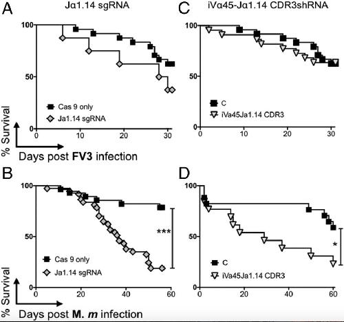 iVα45 T cells are required for host resistance to Mm but not FV3 infection. F0 transgenic iVα45-Jα1.14 CDR3 KD and control tadpoles (stage 52/53) were sham infected (controls) or either i.p. infected with 1 × 104 pfu FV3 (A and C) or 300,000 cfu Mm (B and D), and survival was monitored daily over a 30- and 60-d period, respectively. Each experiment was repeated three times independently (n = 15 in each cohort) and the results were pooled. Survival was determined using Kaplan–Meier, *P < 0.05, ***P < 0.0005. Shown are dejellied controls (black squares), iVα45-Jα1.14 CDR3shRNA Tg (inverted gray triangles), and Jα1.14sgRNA/CRISPR Tg (gray diamonds).
