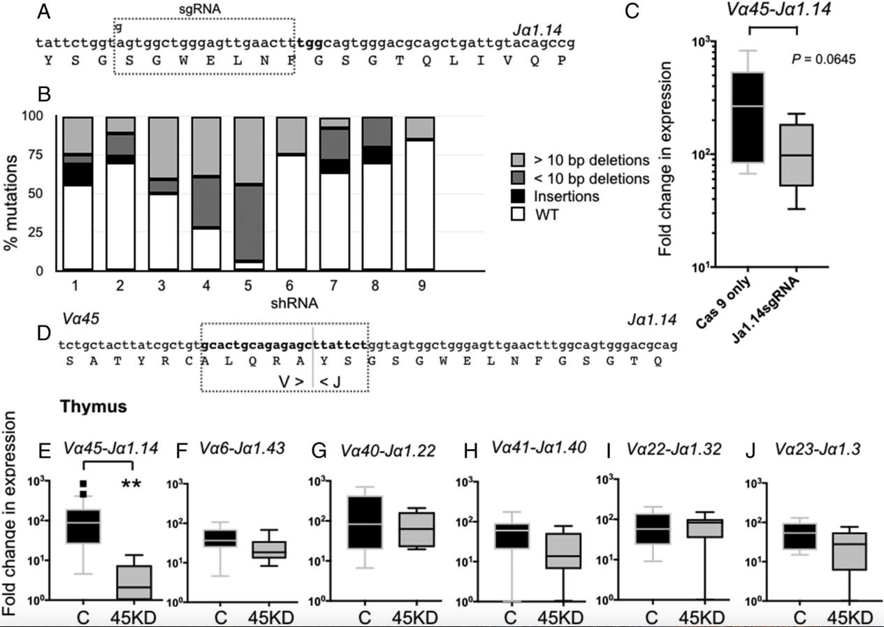 iVα45 T cell loss of function using two different reverse-genetic approaches. (A) Schematic representation showing the modified sgRNA targeting the Jα1.14 gene segment. (B) Bar graph showing the relative contributions of different types of mutations divided into insertions (black), >10-bp deletions (light gray), and <10-bp deletions (dark gray) observed among 10 randomly selected sgRNA/Cas9-treated tadpoles. Note: Multiple alignments of all mutations are shown in SI Appendix, Fig. S6. (C) Expression of the invariant Vα45-Jα1.14 transcript by qPCR in age-matched Cas9-only injected WT controls (black) and CRISPR/Cas9 Jα1.14-injected tadpoles (gray). P = 0.0645 (Studentâs t test). (D) Schematic of the shRNA targeting the iVα45-Jα1.14 CDR3 region, dotted line indicates the Vα/Jα junction. Note: No n-nucleotide diversity was observed in any of the iTCR rearrangments. (EâJ) Relative gene expression by qPCR in the thymus of stage 52/53 tadpoles transgenic with iVα45-Jα1.14 CDR3 KD (gray) and age-matched dejellied controls (black) for iVα45-Jα1.14 (E), iVα6-Jα1.43 (F), iVα40-Jα1.22 (G), iVα41-Jα1.40 (H), iVα22-Jα1.32 (I), and iVα23-Jα1.3 (J). Results were normalized to two endogenous controls (GAPDH and L13) and presented as fold change in expression compared with the lowest level of expression for each individual gene. All results are pools from two separate experiments and presented as individual tadpoles with the mean ± SE (n = 10â12). **P < 0.005 (one-way ANOVA test followed by a post hoc analysis using Tukeyâs multiple comparisons test).