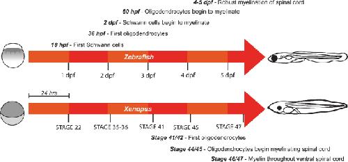 Fig.1. Timeline of developmental myelination in zebrafish larvae and Xenopus tadpoles. Schematic indicates rapid development of zebrafish and Xenopus embryos from one cell stage (left) to larvae (right) with myelinated axons. hpf = hours post fertilisation. dpf = days post fertilisation. |