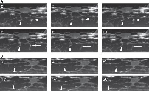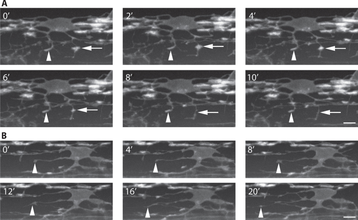 Fig.4. Time-lapse microscopy reveals dynamic behavior of oligodendrocytes. A and B show images from a time-lapse made on a spinning disk confocal microscope, using the stable zebrafish transgenic line Tg(nkx2.2a:meGFP) as a reporter, exemplifying the rapid dynamics of oligodendrocyte processes. Scale barsâ=â5 μm. A shows a cell in the process of initiating myelination. Arrowhead points to an elongated membrane rich process that may represent at nascent myelin sheath that remains stable for the frames shown, whereas the arrow points to a similar elaboration of membrane that is resorbed during the same short period. B shows an oligodendrocyte with a process (arrowhead) that acutely transitions in morphology from a profile indicative of a nascent myelin sheath (0â and 8â) to that of an exploratory process (4â, 12â, 16â and 20â). |