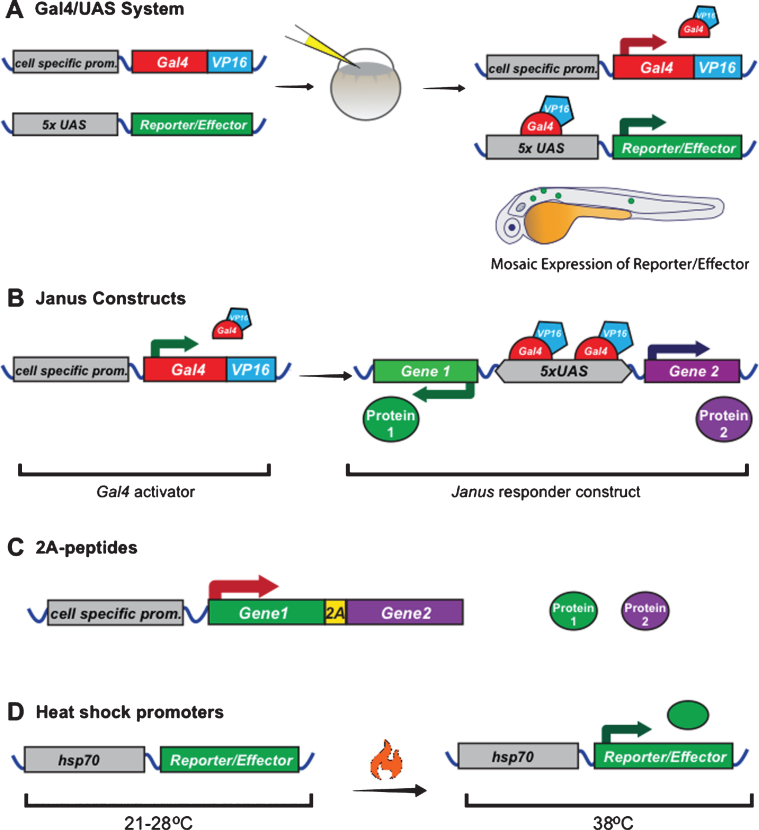 Fig.3. Example strategies to control gene expression in zebrafish and Xenopus. A) Plasmids that can drive expression of the transcriptional activator Gal4-VP16 can be co-injected into embryos together with plasmids that encode genes-of-interest downstream of Upstream Activator Sequences (UAS). Gal4 trans-activates UAS and can amplify gene expression. When injected in this way, it leads to mosaic gene expression. Stable transgenic lines expressing Gal4 in specific cell types or UAS effectors can be generated as in Fig. 1. B) The Gal4-UAS system can be modified to control expression of multiple genes from one plasmid. In the Janus system Gal4 trans-activates UAS, which drives gene expression in both directions, if minimal promoters are present upstream of the genes of interest. C) Alternative strategies exist to express two genes from one construct including the self-cleaving 2A peptide sequence, which can be placed between two open reading frames in one mRNA, which is then translated as two polypeptides due to ribosome skipping. D) Temporal control of gene expression can be mediated by the use of heat sensitive promoters, which are only active at specific temperatures. |